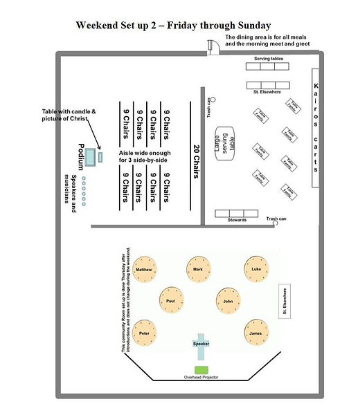 14. The Chapel Coordinator or Agape Coordinator will need several Stewards to Pray-up/pray-down the speakers (2 talks on Saturday)